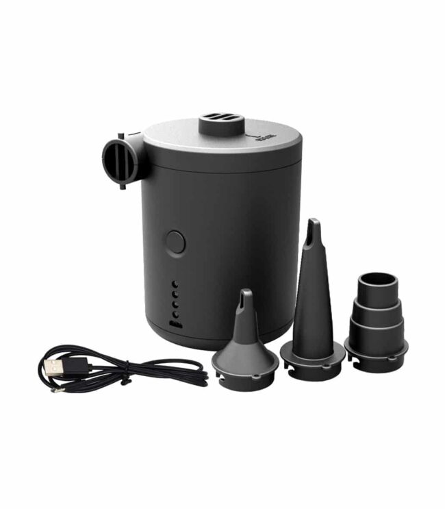 שאבה קומפקטית במיוחד לתרמילאים ומיועדת להוצאה וניפוח אויר מזרונים ועוד. סוללת ליתיום, נורות חיווי סוללה כניסת USB מתאם לסלולרי מתאם למצת הרכב וספק כוח חיצוני, 3 מתאמים לחיבור מוצרים שונים.