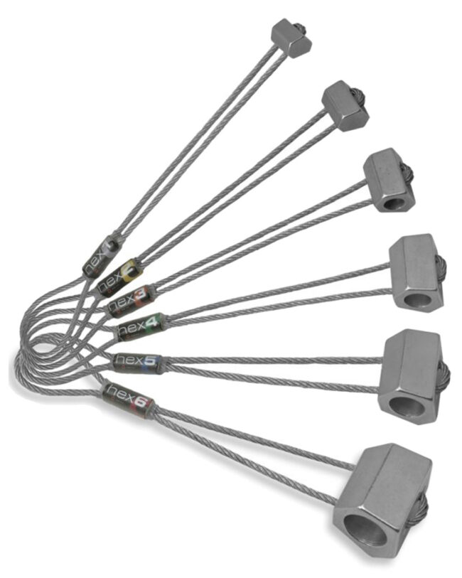 להקסים כבל פלדה המאפשר מיקום נוח של האבן בתוך החריץ ומסומן בקצהו בתווית צבעונית המאפשרת להבדיל בקלות ובמהירות בין המידות השונות. המבנה הלא סימטרי ואקסנטרי של ההקסים, מהדק את אחיזת בחריץ בעת משיכה.