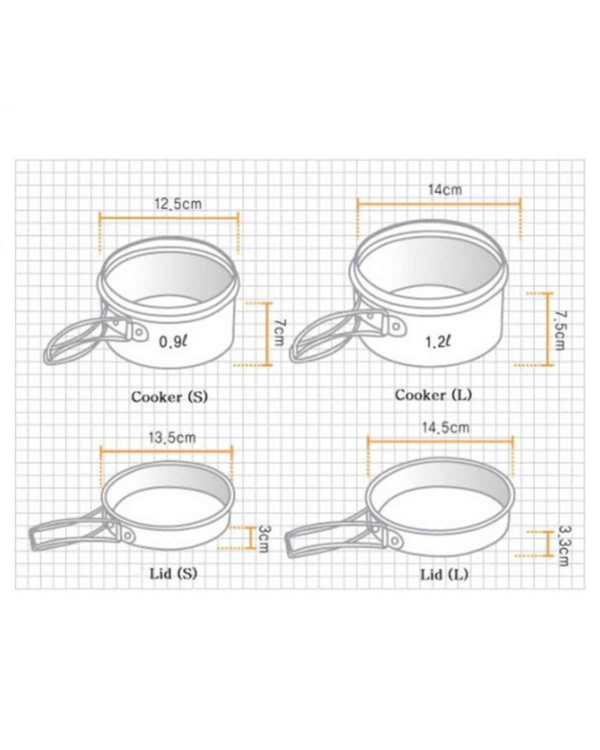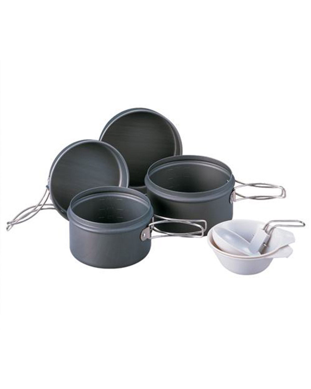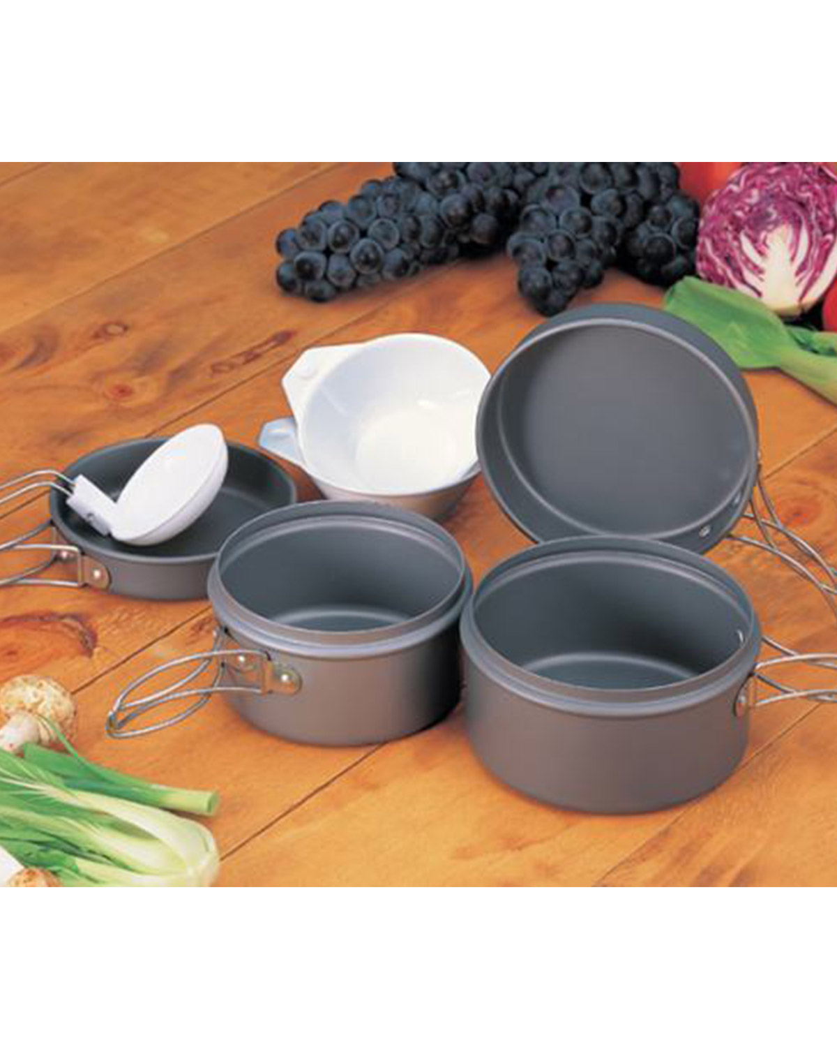 סט קטן וקומפקטי בעל ידיות מתקפלות הבנוי כך שכל חלקי הסט נכנסים לתוך הסיר הגדול על מנת לחסוך מקום בתרמיל.