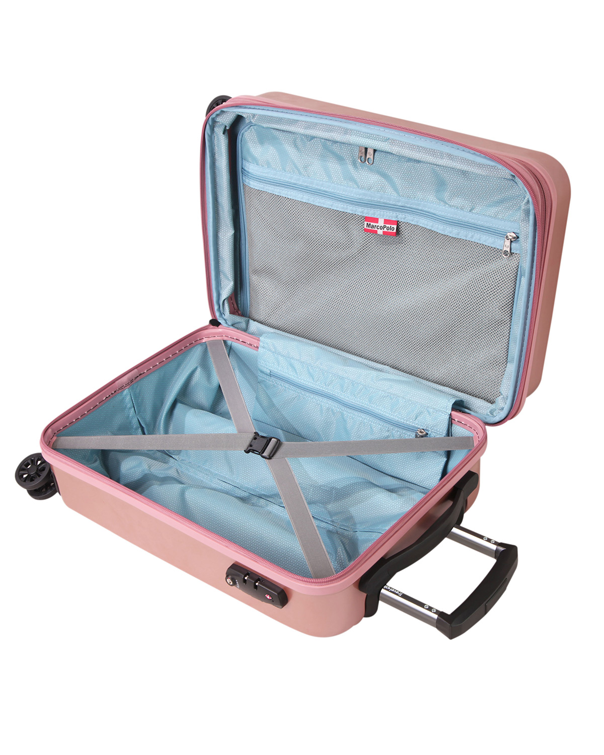 מחיצה פנימית בסגירת רוכסן ותא רשת פנימי ורצועות אלסטיות להידוק הבגדים. לכל מזוודה רוכסן הרחבה המגדיל את נפח המזוודה ב 25% בנפח .