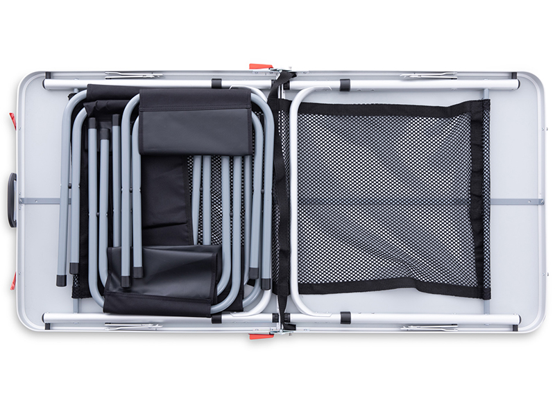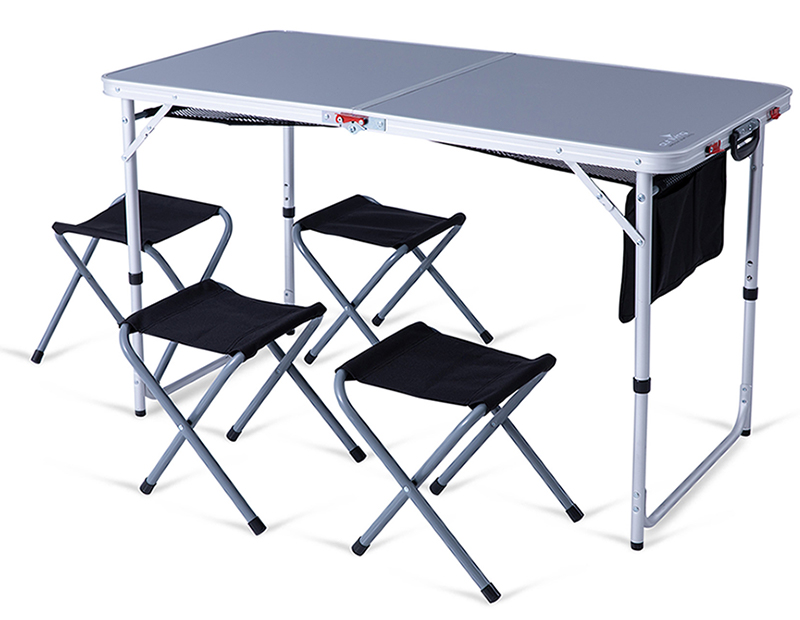שולחן Q4 של חברת OUT LIVING הינו שולחן גדול הכולל 4 שרפרפים.לשולחן משטח APC איכותי המקנה יציבות, חוזק ועמידות לאורך זמן ובעל 3 רמות גובה שונות, השולחן מתקפל למזוודת נשיאה נוחה במיוחד, פתיחה פשוטה ומהירה מאוד של המוצר. נוח לשימוש בכל אירועי השטח, קמפינג, ים, פיקניק, מחנאות וכו'-