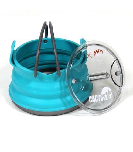 סיר קומקום מתקפל לגזייה של חברת CACTUS שעשוי מסיליקון עם תחתית אלומניום מבנה הסיר יוצר מוצר קומקפטי לאחסון בתרמיל וקל , מגיע עם מכסה עם שני ידיות שניתן להרימו . מתאים לבישול ארוחה ל 2 אנשים או קפה ל 4 אנשים . נפח הסיר 850 מל כמעט ליטר .