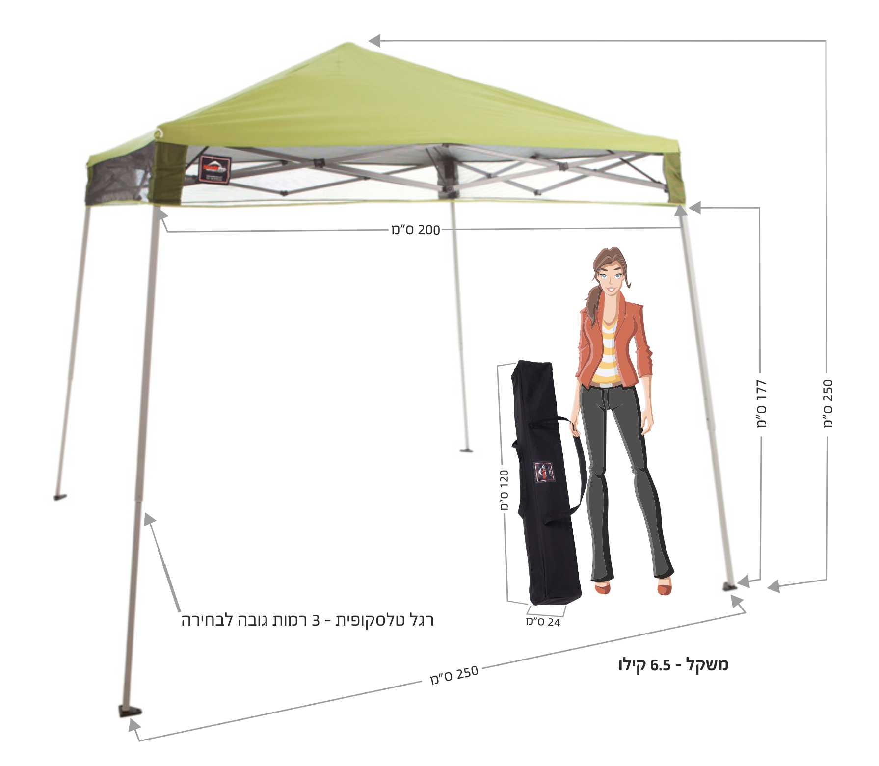 הגזיבו מגיע מקופל בתיק נשיאה עם רתמות נשיאה , קל מאוד ונוח לאחסון ברכב. רגל טלפסוקפית עם 3 רמות גובה. מגיע ב 2 צבעים.