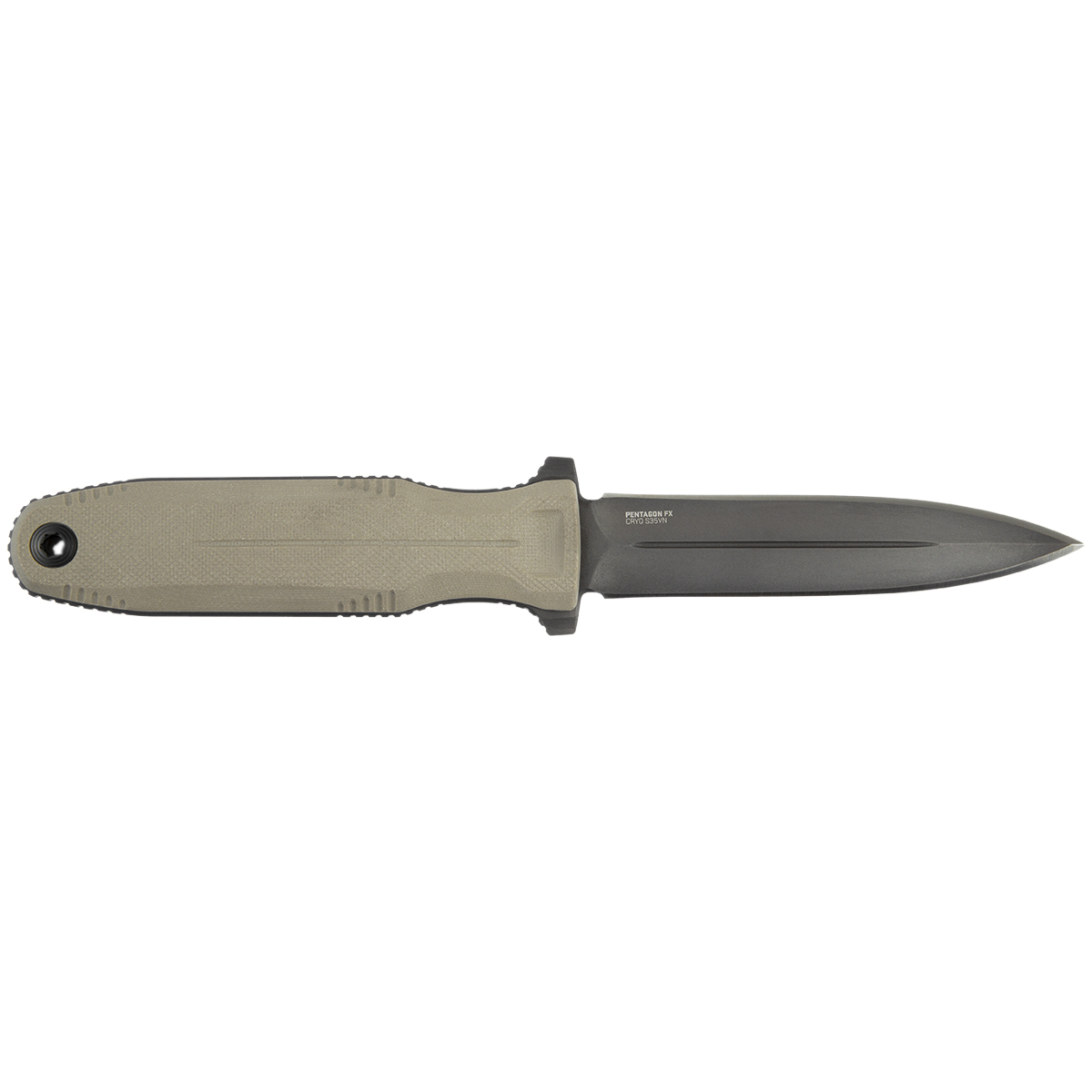 סכין ה- Pentagon FX Blackout בנויה בתצורת Full-Tang, מה שמקנה לה עמידות גבוהה יותר בפני שברים וזעזועים. ידית הסכין עשויה משתי פלטות של G-10 בצבע חום מדברי אשר מחוברות בברגים לגוף הידית. ניתן לנתק את פלטות ה G-10 ובכך הסכין הופכת צרה, קלה ומינימאלית יותר. פלטות ה G-10 מספקות למשתמש אחיזה נוחה ובטוחה גם בתנאי מזג אויר לא אידיאליים.