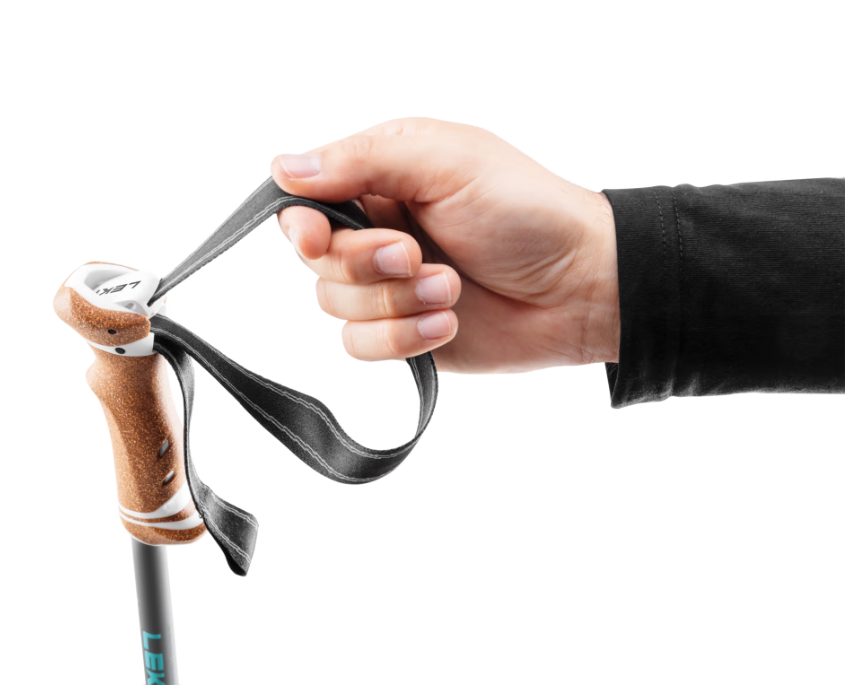 מקלות ההליכה של חברת LEKI בעלות אחיזת PAS עם משטח תמיכה מעוגל ורצועת בטיחות מתכווננת, אידיאלי עבור ענפי ספורט רבים.